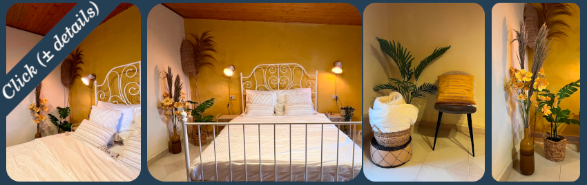 Aan de voorzijde op de bovenverdieping van Casa Di Esmee ligt deze zonnige slaapkamer in geeltinten. Een fijne kamer voor wie houdt van een natuurlijke en rustgevende uitstraling. Deze slaapkamer heeft openslaande deuren aan de voorzijde en geeft hierdoor direct toegang tot het grote dakterras. Opstaan en nog even verder dromen op het dakterras. Dat maakt het wakker worden toch net even mooier? De kamer heeft nog steeds die authentieke sfeer door het houten plafond, die bewaard is gebleven uit de jaren 70. |